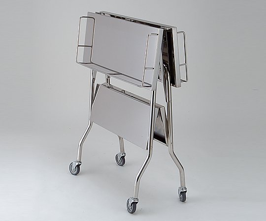 ●材質:ステンレス(SUS304)●キャスター:φ75mm(ストッパー無し)●高さ(手摺含む):850mm●棚間隔:410mm●耐荷重:70kg以下●折りたたみ時寸法:750×350×935mm●幅×奥行×高さ(mm):750×600×800●型番:309