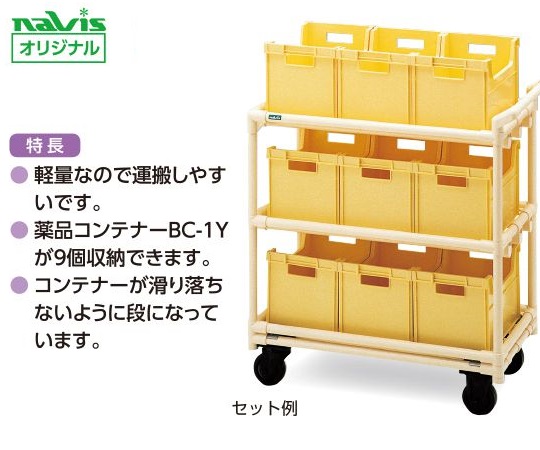 ●軽量なので運搬しやすいです。●薬品コンテナーBC-1Yが9個収納できます。●コンテナーが滑り落ちないように段になっています。●材質:鋼鉄パイプ(AAS樹脂加工)●キャスター:φ100mmプラスチック製(自在2輪・ストッパー無し)●幅×奥行×高さ(mm):850×410×900●※本体には薬品コンテナー(BC-1Y型)・仕切板は付属していません。●型番:本体