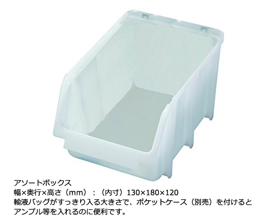 ●1患者1ボックス管理を行うベーシックタイプのオーダリングカートです。●ボックスは輸液バッグがすっきり入る大きさで、ポケットケース(別売)を付けるとアンプル等を入れるのに便利です。●ボックスは載せるだけで固定でき、重ね置きも可能です。●大きめのキャスターを採用しており、軽い力で搬送できます。●ネームシールは簡単に剥がせて跡が残らず、貼り替えも可能です。●材質:ステンレス(SUS304)●キャスター:φ125mm(2輪ストッパー付き)●耐荷重:20kg/段●ネームシールサイズ:105×25mm●付属品:アソートボックス40個(片面20個×両面)、ネームシール40枚●幅×奥行×高さ(mm):約960×480×1190
