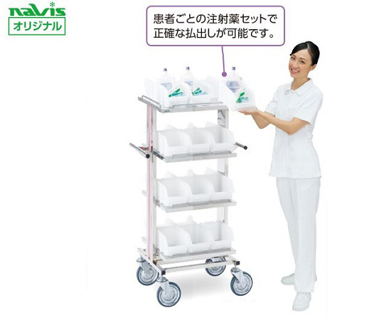 ●患者ごとの注射薬セットで正確な払出しが可能です。●1患者1ボックス管理を行うベーシックタイプのオーダリングカートです。●ボックスは輸液バッグがすっきり入る大きさで、ポケットケース(別売)を付けるとアンプル等を入れるのに便利です。●ボックスは載せるだけで固定でき、重ね置きも可能です。●大きめのキャスターを採用しており、軽い力で搬送できます。●ネームシールは簡単に剥がせて跡が残らず、貼り替えも可能です。●材質:ステンレス(SUS304)●キャスター:φ125mm(2輪ストッパー付き)●耐荷重:20kg/段●ネームシールサイズ:105×25mm●付属品:アソートボックス24個(片面12個×両面)、ネームシール24枚●幅×奥行×高さ(mm):約640×480×1190