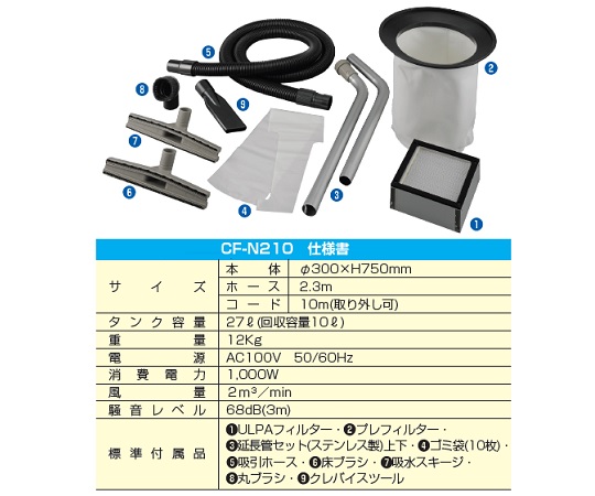 ●手術室・中央材料室等の乾湿無菌清掃に!●吐出された空気はULPAフィルターにより濾過し、無菌浄化されます。●消毒液、血液などの過酷な対象物に耐えるように、耐薬品性ステンレス製タンクになっています。●回収した汚水やゴミは手を汚さずにポリ袋でワンタッチ回収できます。●オーバーフロー防止フロート付きで、定量以上の水を吸入した時には、吸引が止まりモーターを保護します。●本体サイズ(mm):φ300×750●対象:第1級クリーンルーム●集塵効率:0.1μ粒子にて99.99%以上●集塵要素:ULPAフィルター・ニードルフェルトプレフィルター(洗浄使用可)・ポリエチレン袋(空気孔付)●風量:2m3/min(MAX)●吸入圧:1900mmAq(MAX)●吸込仕事率:240W●タンク容量:27L(回収容量10L)●本体重量:12kg●コード長:10m●ホース長:2.3m●運転音:68dB(50/60Hz本体から3mの位置)●電源:AC100V50/60Hz●消費電力:1000W●用途:クリーンルーム・手術室・ICU・CCU・中央材料室・無菌製剤室・無菌動物実験室などの非汚染ゾーンの清掃浄化●付属品:床面ブラシ1個、丸ブラシ1個、吸水スキージ1個、クレバイスツール1個、吸引ホース1本、ゴアテックスプレフィルター1個、専用ポリ袋(可燃)10枚