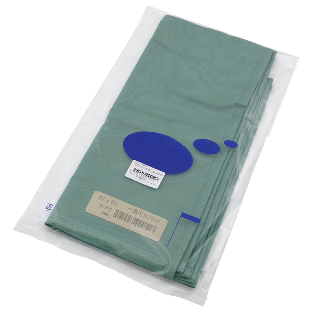 ●裏面にサイズと種類を印字したラベルが付いています。●素材:綿100%●オートクレーブ可●縦×横×穴径(mm):600×600×φ90●型番:Ad90302-566●色:グリーン●ベージュラベル