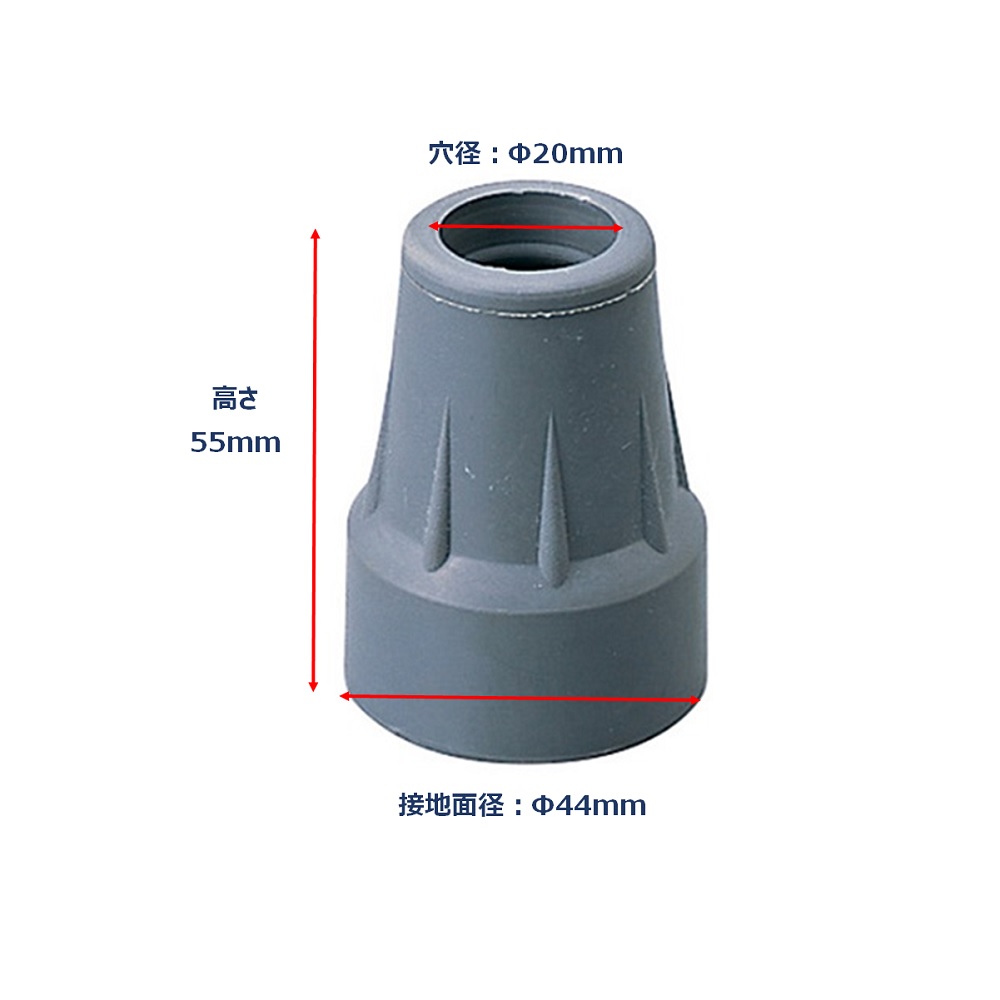 ●0-6617-11~13、41~43 松葉杖(アルミコート加工)交換用部品です。●交換用先端ゴム●入数:1個●材質:SRBゴム(スチレンブタジエンゴム)●サイズ:穴径φ20×接地面径φ44×高さ55mm