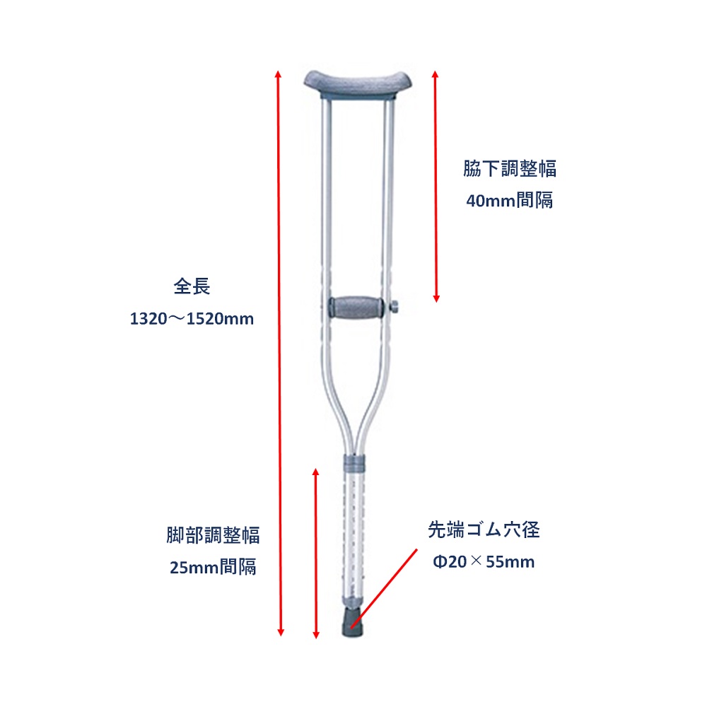 ●グリップの高さ調節がしやすい、星型ネジを使用しています。●高さ調節は簡単なプッシュボタン式です。●全長(mm):1320~1520●重量(kg/組):1.8●材質:アルミニウム・コート加工、パットグリップ/特殊塩化ビニル、脇パッド・グリップ/エラストマー(TPR)、先端ゴム/SRBゴム(スチレンブタジエンゴム)、中芯/金属、ノブネジ/樹脂●調整幅:脚部/約25mm間隔、脇下/40mm間隔●適応身長(参考):178~198cm●シャフト先端径:Φ22mm●先端ゴムサイズ:穴径Φ20×接地面径Φ44×高さ55mm●入数:2本1組