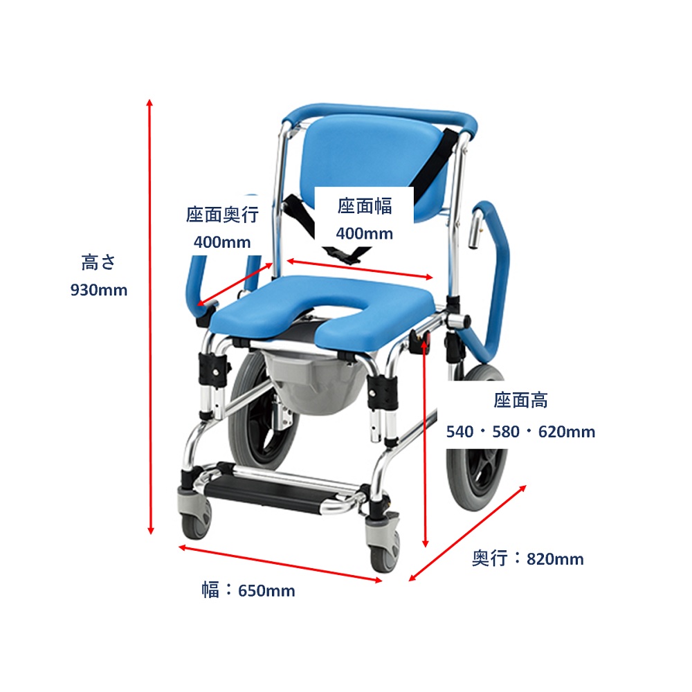 ●やわらかいウレタンクッションが座り心地のよいシャワーキャリアーです。●大きな後輪ホイールは、移動介助の負担を軽減します。●ステップは場所を取らない収納式です。●ひじ掛けはプッシュボタンを押すとロックが外れ、着座・移動が簡単です。●座面高さが3段階調節できます。●可動式ひじ掛付き(ブルー)●幅×奥行×高さ(mm):650×820×930●材質:本体/アルミニウム、ハンドル・グリップ/EVA(酢酸ビニル樹脂)、背もたれ・シート/PU(ポリウレタン)フォーム●座面サイズ:400×400mm●座面高:540・580・620mm(●3段階調節)●キャスター:前輪/φ100mm(ストッパー付き)、後輪/φ350mm●重量:13kg●耐荷重:100kg●付属品:固定ベルト×1本・角型シートカバー(EVA樹脂)・フタ付きバケツ(ポリプロピレン製)●組み立て式●※介護保険適用対象品(特定福祉用具)