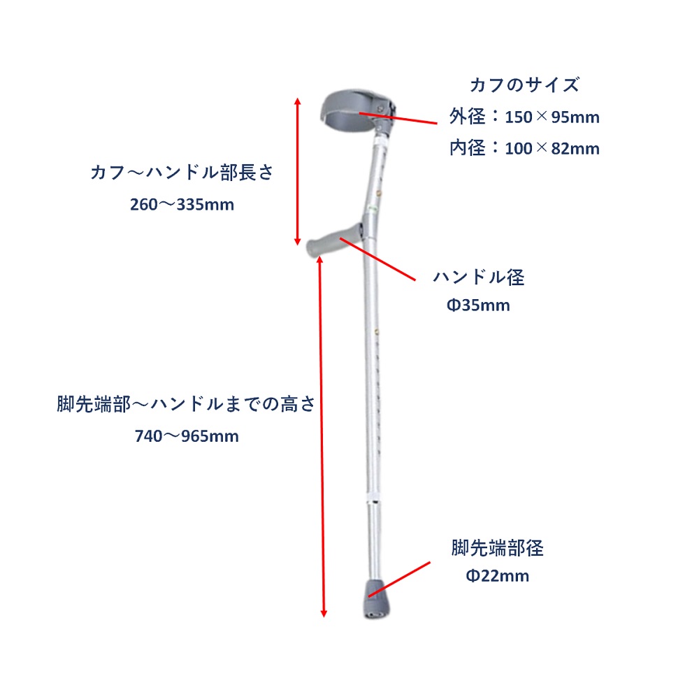 ●軽量で、高さ調節機能が2ヶ所に付いています。●材質:シャフト/アルミニウム、グリップ/PVC(塩化ビニル樹脂)、カフ/PP(ポリプロピレン)●高さ調節:腕部/25mm間隔・4段階調節、脚部/25mm間隔・10段階調節●ハンドルまでの高さ:740~965mm●カフ~ハンドル部の長さ:260~335mm●脚先端部径:φ22mm●重量:847g●適合身長(目安):160~185cm●型番:HC6012
