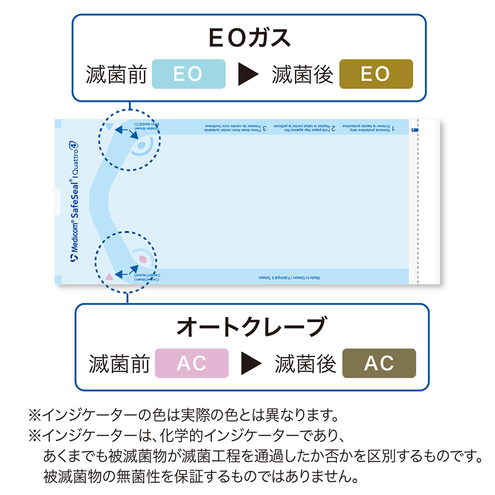 ●バッグの外側と内側にISO11140・Class1のインジケーターを採用し、滅菌条件の通過をより正確に確認できます。●フィルムと滅菌紙の溶着幅を広げ、滅菌時のシール剥がれを低減しています。●強力粘着テープ付きで、器具を簡単に密封できます。●ヒートシーラー不要の強力粘着テープ●内容物の見えやすい透明フィルムタイプ●環境にやさしい水性インクを採用●幅×長さ(mm):133×254●入数:1箱(200枚入)●材質:フィルム/2層フィルム(PET+CPP)、紙/医療等級紙●内寸法:113×227mm●オートクレーブ・EOガス両用●テープシールタイプ●ISO11670・EN868準拠