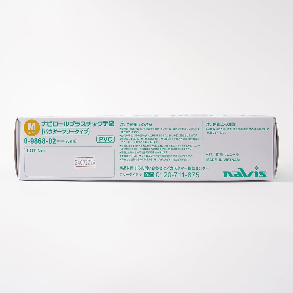●パウダーがついていませんので衣服を汚しません。●サイズ:M●入数:1箱(100枚入)●材質:PVC(塩化ビニル樹脂)●全長:約250mm●中指長:約82mm●掌の幅:約95mm●厚み:約0.05~0.15mm (指先/0.05mm以上, 掌/0.06mm以上)●重量:約5.0g/枚, 542g/箱●左右兼用●パウダーフリー●箱サイズ:243×129×60mm●●*大箱で注文希望の場合はご注文時に必ず「大箱希望」とご依頼をお願いいたします。●ケース入数:100枚/箱 × 10箱