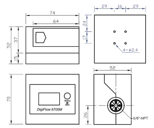 ●水平に取り付けが可能です。 ●電池駆動タイプですので、持ち運びに便利です。●瞬時流量範囲(L/min):1.2~12.0●接続口:3/8"NPTメス●流体温度(℃):0~40●最高使用圧力(Mpa):0.6●適合流体:水●積算流量:99999L●測定精度:±10%(F.S.)以内●機能:オートON/OFF・バッテリー残量アラーム●接液部主要材質:POM・ナイロン系プラマグ・SUS304・EPDM(エチレンプロピレンゴム)など●電源:単4乾電池×2本(テスト用付属)●サイズ:74×52×70mm●重量:140g