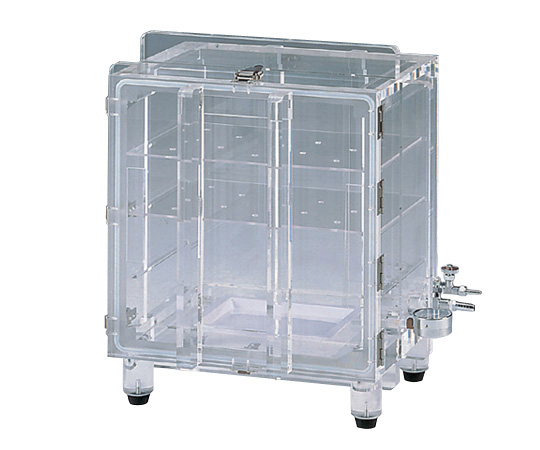 ●真空度が一目でわかる真空計付属●真空バルブは外径φ8mm・φ14mmの2ポートを準備●密閉性の高いシリコンパッキンを使用しています。●-Cはボックス内にコンセント、外にスイッチが付いています。●材質:本体/透明強化PMMA(アクリル)(板厚:25mm)、バルブ・真空計取り付け部/PC(ポリカーボネート)●許容真空度:1Torr(約133Pa)●棚板寸法:398×260×4tmm●棚段数:3段(棚間隔:96mm)●棚板耐荷重:約2kg/段(均等荷重)●容量:48L●重量:35kg●外部スイッチ付きコンセント:AC 100V接地型2P 2個(合計電流15A以内)●外寸法(mm):550×452×590●内寸法(mm):400×300×400●コンセント付き●付属品:真空バルブ:小/外径φ8mm・大/外径φ14mm(各1個)、真空計×1個、PMMA(アクリル)製棚板×2枚、シリカゲル皿×1枚●推奨真空ポンプ:(1-672-07)油回転真空ポンプG-50SA、(1-4148-05)ドライ真空ポンプDTC-60、(1-671-11)ドライ真空ポンプDA-60D