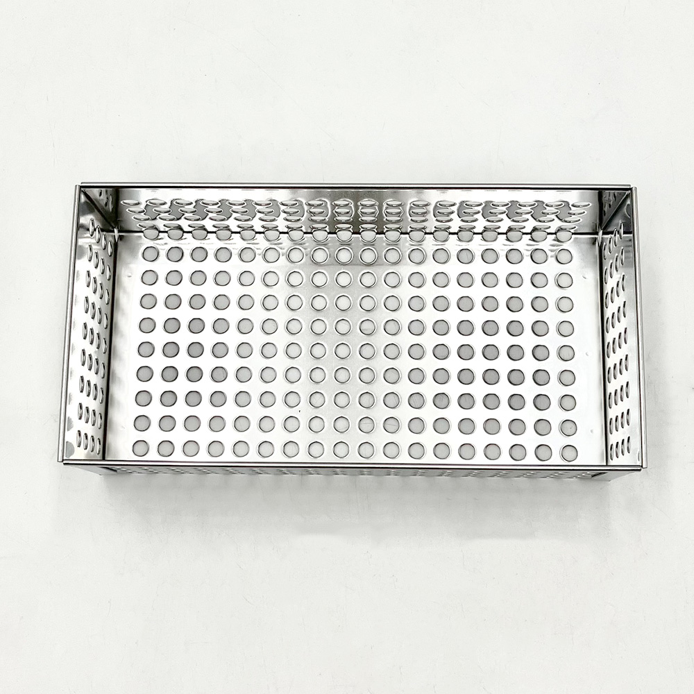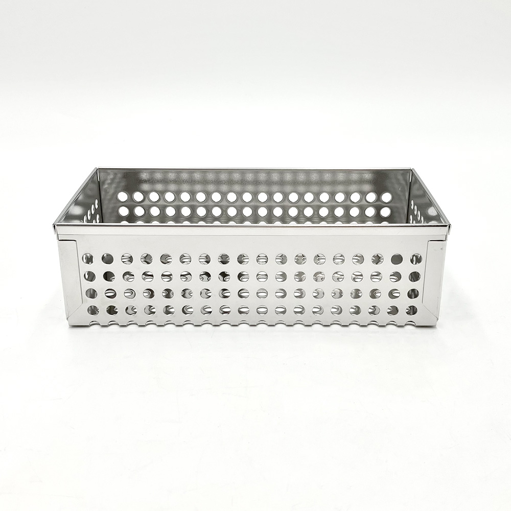 ●材質:ステンレス(SUS304)・電解研磨仕上げ●穴径:φ6mm●穴ピッチ:10mm●外寸法(mm): 約200×104×60●内寸法(mm):200×100×60●底外寸(mm):約202×100●取手:無●オートクレーブ可
