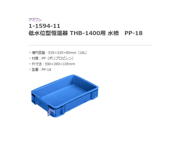 ●最低水位45mmで使用可能な低水位タイプの恒温水槽です。●広い作業面を確保しており、多数の試料の処理に適しています。●水槽(別売)は排水コック付きで、水の交換・清掃が容易です。●本体●外寸法(mm):408×136×205●温度設定範囲:室温+5~60℃●温度調節精度:±1℃(コントローラー単体での性能)●温度制御方式:デジタルPID制御●ヒーター容量:1400W●タイマー機能付き(ONタイマー、OFFタイマー、SVスタート)●材質:本体/SUS430、水槽/PP●安全装置:独立温度過昇防止、フロート式空焚き防止、温度ヒューズ付きモーター●電源:AC100V 50/60Hz 14A●電源コード長:2m(3Pプラグ)●水槽内寸法:535×335×90mm(18L)●本体重量:約3.5kg●※本体に水槽は付属していません。