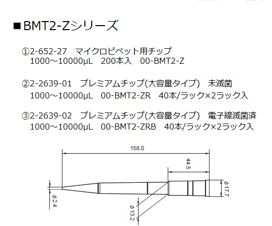 ●安心のメーカー5年間保証・修理対象となる部品交換・オーバーホール・精度確認等、無償で対応します(購入後、登録が必要)。●耐久性・耐薬品性に優れています。●手の温度による精度変化が生じにくいです。●ストローク荷重:標準●適合チップ:BMT2-Z●UV滅菌・オートクレーブ可(121℃)●容量設定方式:可変式●容量範囲:1000~10000uL●目盛単位:10uL●精度:±2.0~±0.4%●再現性:≦0.4~≦0.2%●★シングルチャンネル●★オートクレーブ可