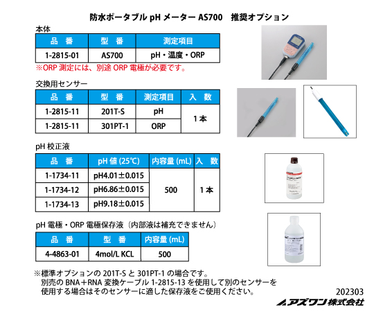 ●防水、コンパクト、高精度!●見やすい大きなLCD画面で、ブルーのバックライトが点灯します。●付属の電極1本で、pH・温度が測定できます。●オートパワーオフ機能(10分/20分)、バックライト表示時間設定機能(1分/3分/6分)付きです。●電極(別売)を交換すればORPも測定できます。●便利なキャリングケース入です。●測定範囲:pH/0~14pH(※1)、温度/0~100℃●精度:±0.01pH±1digit●電源:単3乾電池(1.5V)×2本(テスト用付属)●サイズ:本体/65×120×31mm●重量:180g●防水:IP57●付属品:専用pH電極201T-S×1本、 pH標準液(NIST規格 pH4.01・pH6.86・pH9.18×各1本)●測定項目:pH・温度・ORP●※1:強アルカリを測定の場合は、強アルカリ対応の電極(1-054-23)及びBNC+RNA変換ケーブル(1-2815-13)が必要です。●基本変換ケーブル(1-054-XX) を使うことで、各種電極が使用可能です。