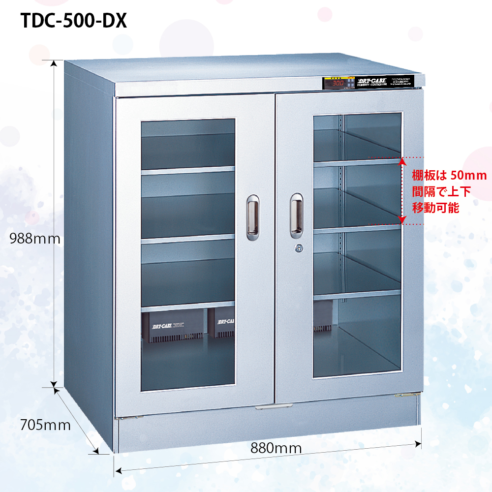 ●センターピラーレス 中央支柱がないので横長のものも出し入れ簡単●湿度設定機能付きデジタル湿度計を標準装備(電池不要)●湿度設定による定湿度運転が可能●使い易い全面ワイドドアー(マグネットパッキン式)、ロック、キー付き●除湿装置内の特殊乾燥剤は交換不要●無音、無振動で長期連続運転が可能●湿度計センサーは校正証書の発行が可能(オプション)●中湿度型25~50%RH●除湿・湿度調整:除湿装置、デジタルコントローラーによる自動調節式●外寸:W880×D705×H988mm●内寸:W878(間口寸法830)×D650×H855(間口寸法800)mm●有効内容量:485L●製品重量:68kg●キャビネット材質:スチール●塗装:粉体塗装、グレー●扉:スチール、ガラス、マグネットパッキン●湿度計:デジタル湿度計●湿度計モニター精度:±3~4.5%RH●電源:AC100V●消費電力:10.8W(最大360W)●付属品:棚板×3、キー×2●棚板耐荷重:50kg/枚●ドライキャビには庫内の加湿(湿度を上げる)、加熱(温度を上げる)、冷却(温度を下げる)等の機能はありません。●最大消費電力の表示は起動時の瞬間のみです。