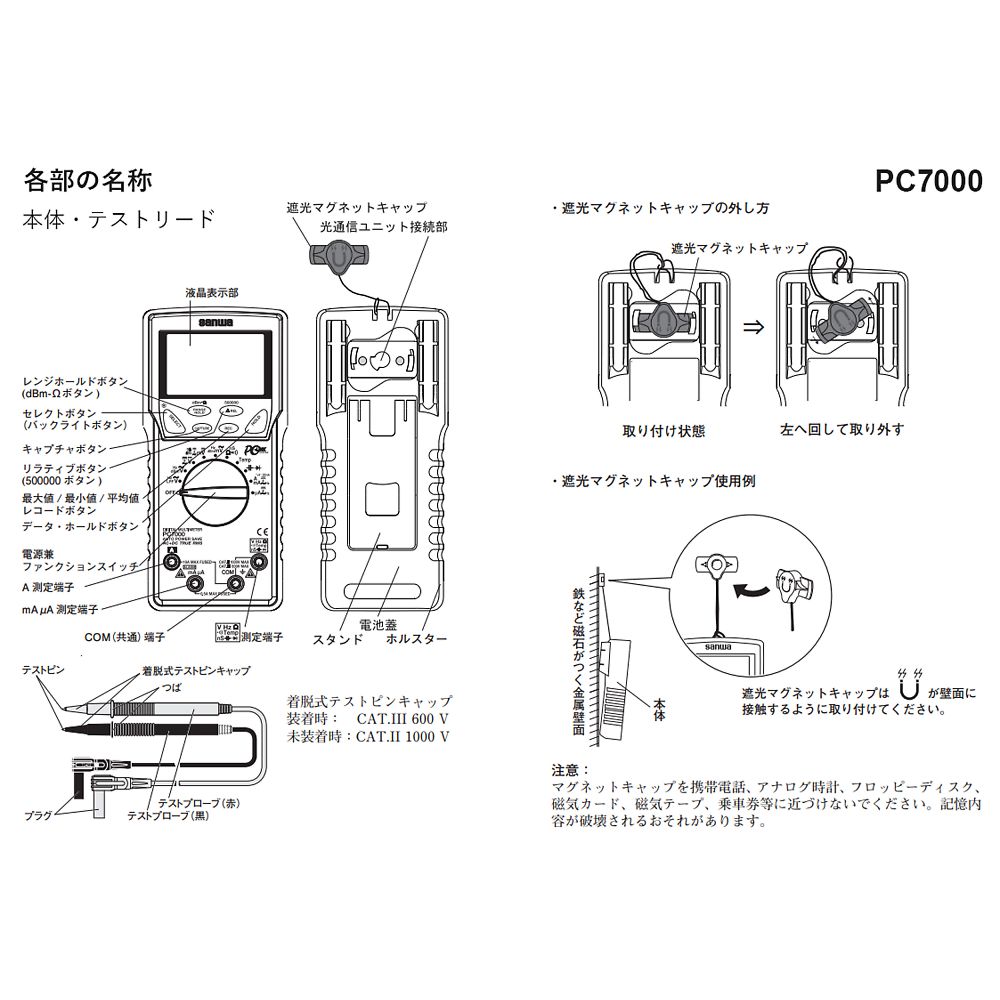 ●ソフトウェア(PC Link 7)と光リンクUSB接続ケーブル(KB-USB7)を使用すると、パソコンへ接続可能です。 ●ローパスフィルター内蔵・50,000/500,000カウント(切り替え可)表示タイプですので正確な測定が可能です。●レンジ:DCV/500mV・5/50/500/1000V、ACV/500mV・5/50/500/1000V、DCA/500/5000μA・50/500mA・5/10A、ACA/500/5000μA・50/500mA・5/10A、Ω/500Ω・5/50/500kΩ・5/50MΩ●対応OS:Windows?7(32/64bit)/8(32/64bit)/10(64bit)●電源:006P(9V)乾電池×1個(内蔵)●サイズ:86×52×184mm●重量:430g(ホルスター含む)●型番:PC7000●付属品:K熱電対温度センサー・テストリード・ホルスター●※本体にソフトウェア・ケーブルは付属していません。
