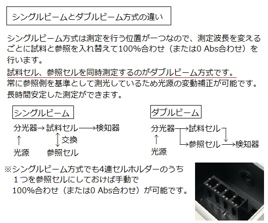 ●定量測定もできる多機能ハイスペックタイプ。●シングルビームタイプの紫外可視光用分光光度計です。●標準カーブ、マルチ波長計測、波長スキャニング、キネティックス、DNA/タンパク質分析が可能です。●USBメモリーでデータの保存が容易にできます。●4つのセルを搭載できます。●サイズ(mm):490×385×230●重量(kg):14●シングルビーム●波長範囲:190~1100nm●スペクトルバンド幅:2nm●波長精度:±0.5nm●波長再現性:0.3nm●測定方式:シングルビーム(1200ライン/mm)●測定範囲:透過率/0~200%T、吸光度/-0.3~+3A、濃度/0~9999C●測定精度:透過率/±0.5% T●迷光:0.05% T@220nm、360nm●スキャン速度:最大3000nm/min●安定度:0.0008A/h@500nm●セルホルダー:4連セルホルダー●光源:タングステンランプ、重水素ランプ●インターフェース:USB●対応OS:Windows(R)8/8.1/10(32・64bit)/11(64bit)●電源:AC100V 50/60Hz●付属品:USBケーブル、ガラス角セル×4本、石英角セル×2本、USBキー、ソフトウェア(USBメモリ)