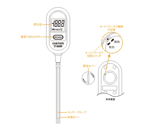 ●ワンボタン式で操作が容易です。●測定範囲:-50~+350℃●分解能:-9.9~+199.9℃/0.1℃、その他/1℃●精度:±0.8%または±0.8℃のどちらか大きい方●サンプリング:1回/秒●材質:本体/ABS樹脂、センサー/ステンレス(SUS304)●電源:CR2032リチウム電池×1個(テスト用付属)●サイズ:本体/39.4×20×207mm、センサー/φ3×110mm●重量:約50g●防水:IP65
