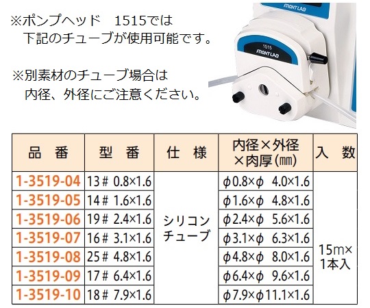 ●ラボ用小流量チューブポンプです。チューブサイズも各種取り揃えました。●チューブはワンタッチで交換可能です。●呼び水ボタン付きで、素早く開始できます。●ポンプヘッドは別売のDG-1・2、1515、2515(1-3519-13~16)も取り付け可能です。●ポンプヘッド仕様:シングルレバーダウン式(1515)●流量(mL/min):160※●回転数:0.1~100rpm●精度:0.1rpm●表示:LED3桁●正転・逆転切り替え機能付き●ポンプヘッド材質:外装/ポリエーテルスルホン、 ローラー/SUS304●電源:AC100V 50/60Hz3Pプラグ付き●消費電力:15W以下●サイズ:130×293×149mm●重量(ポンプヘッド含む):3.5kg●セット内容:25#シリコンチューブ2m×1本●※フットスイッチ(1-3519-17)は使用できません。●※25#シリコンチューブ使用・常温・市水100rpm時の値です。