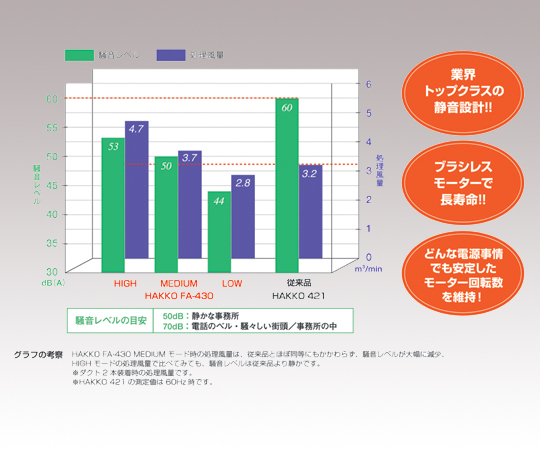 ●軽量・コンパクトで取手が付いており、持ち運びが容易です。●最大処理風量:ダクト1本使用時/4.1m3/min(145cFm)、ダクト2本使用時/4.7m3/min(167cFm)●捕集効率:LOW・MEDIUMモード/0.3μm粒子を99.97%以上除去、HIGHモード/0.3μm粒子を99.96%以上除去●騒音レベル:50dB●静圧:1500Pa●機能:風量調節(LOW・MEDIUM・HIGHモード)・フィルター交換お知らせ●電源:AC100V 50/60Hz 3Pプラグ付き●消費電力:120W●重量:7.5kg●型番:FA430-01●サイズ(mm):330×343×366(本体)●※ダクトセットは付属していません。●セット内容:本体、電源コード、メインフィルター(A1573)、プレフィルター10枚入(A1572)、キャップ(B3619)