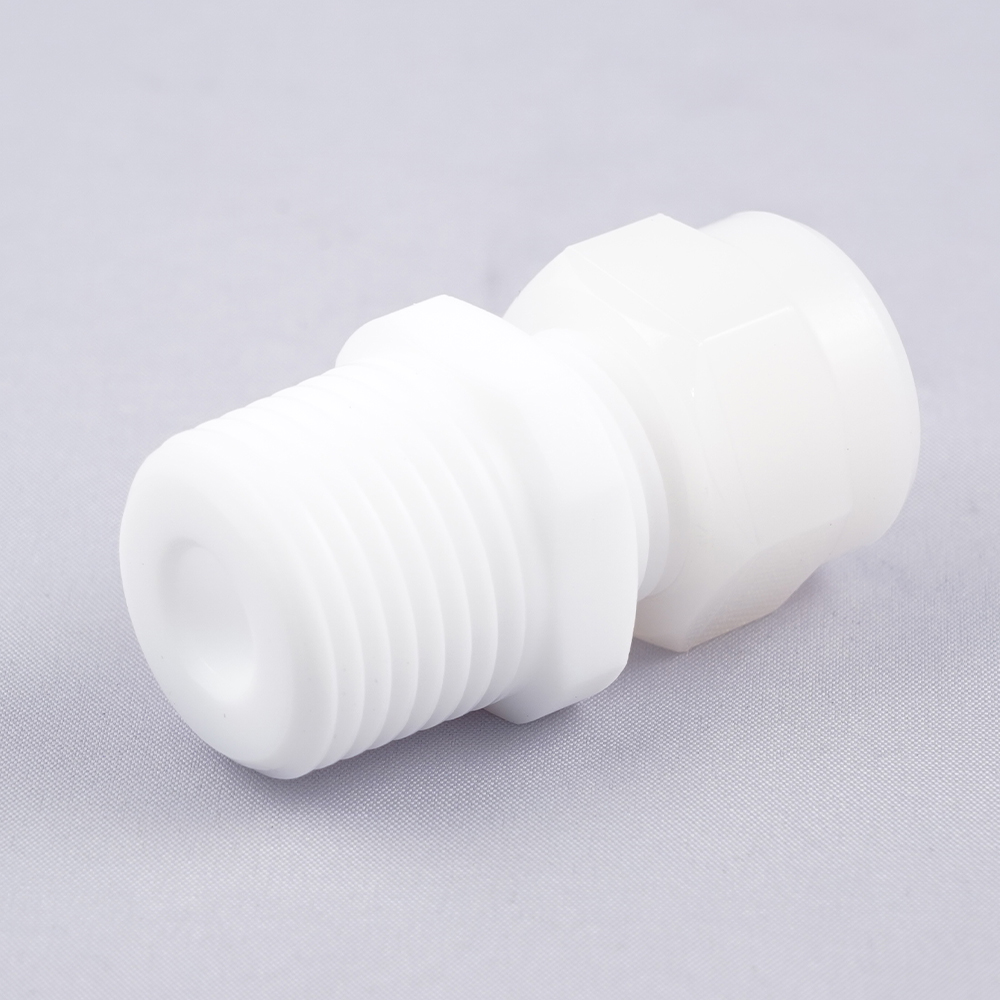 ●型番:30-10MC8-C●材質:ボディ/PTFE(フッ素樹脂)、ナット/ECTFE(フッ素樹脂)●最高使用温度:100℃●テーパ収縮シール方式●適合チューブ材質:PFA・PTFE●チューブ径:3/8インチ●ネジサイズ:R1/2