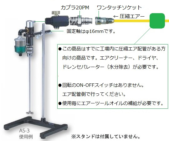 ●過負荷になるとモーターの作動が停止し、負荷が減じれば正常運転の状態に戻ります。●構成部品数が少なく、構造が堅牢です。●給気の加減(減速用バルブ)により、一定の範囲内で回転数を変えることができます。●エキゾーストクリーナーが組みこんであり、消音効果とオイルミスト除去効果がございます。●回転数:2000rpm●トルク(最大出力時):約2N・m(20kgf・cm)●最大出力:220W●供給エア圧力:約0.59MPa(6kg/cm2)●使用シャフト径:φ1~8mm●ポート径:PT1/4●重量(本体のみ):1.24kg●付属品:撹拌棒φ8×450mm1本、撹拌羽根φ60mm×1個、カプラ20PM×1個●※スタンド・ムッフは付属していません。