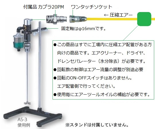 ●過負荷になるとモーターの作動が停止し、負荷が減じれば正常運転の状態に戻ります。●構成部品数が少なく、構造が堅牢です。●給気の加減(減速用バルブ)により、一定の範囲内で回転数を変えることができます。●エキゾーストクリーナーが組みこんであり、消音効果とオイルミスト除去効果がございます。●回転数:4700rpm●トルク(最大出力時):約0.6N・m(6kgf・cm)●最大出力:150W●供給エア圧力:約0.59MPa(6kg/cm2)●使用シャフト径:φ1~8mm●ポート径:PT1/4●重量(本体のみ):1.27kg●付属品:撹拌棒φ8×450mm1本、撹拌羽根φ60mm×1個、カプラ20PM×1個●※スタンド・ムッフは付属していません。