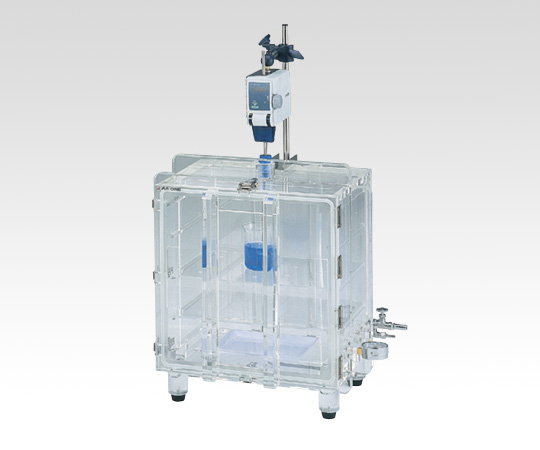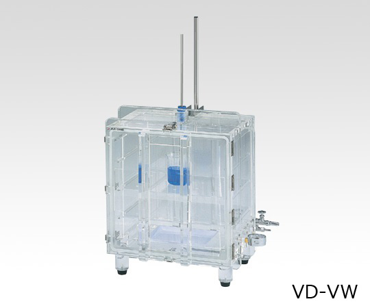 ●真空環境で撹拌することにより、試料中に含まれる気泡を容易に脱泡する事が可能です。 ●本体は透明アクリル製ですので、実験中の内部観察も容易に行えます。●外寸法(突起部除く):550×452×590mm●内寸法:400×300×400mm●材質:本体/透明PMMA(アクリル)、バルブ・真空計取り付け部/PC(ポリカーボネート)●容量:48L●板厚:25mm●棚段数:3段●減圧許容度:1Torr(約133Pa)●真空バルブ:小/外径φ8mmホースニップル、大/外径φ14mmホースニップル●重量:36kg●棚板耐荷重:2kg/枚●棚板×2枚●付属品:φ8mm撹拌棒用バキュームシール・撹拌機取り付け用支柱(φ16mm)・シリカゲル皿×1枚●推奨真空ポンプ:1-672-07 油回転真空ポンプ G-50SA●※クランプ・撹拌機は付属していません。※トルネード撹拌機専用です。