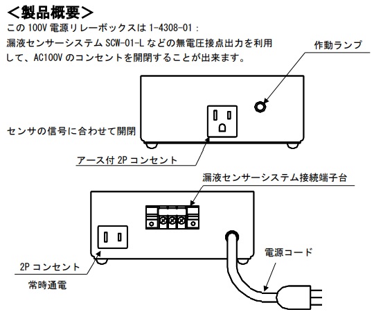 ●2つの出力を持ち、ひとつは常時ONですので漏液センサシステムの電源として使用できます。●100V電源リレーボックス●リレー方式:メカニカルリレー●出力:2系統合わせて最大10Aまで●サイズ:100×124×70mm●電源コード長:2.8m●付属品:本体接続用ケーブル(1m)付き●※腐食性のガス等の雰囲気中では使用しないでください。