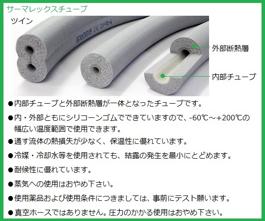 ●内部チューブと外部断熱層が一体となったチューブです。●熱損失が少なく保温性に優れています。●耐候性に優れています。●材質:シリコンゴム●使用温度範囲:-60~+200℃●熱伝導率:スポンジ部/約0.075W/(m・K)、チューブ部/約0.2W/(m・K)●発泡厚:10mm●★内径φ15mm×外径φ21mm、全外径φ41mm●定尺(最大長さ):20m●★※販売は1m単位です。表示価格は1mあたりの価格です。●※注文数はm単位でお願いいたします。●★※注文例:数量「3」でご注文いただくと、3mの商品をお届けいたします。