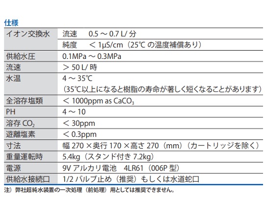 ●活性炭・イオン交換カートリッジが一体型ですので、設置が容易にできスペースもとりません。●イオン交換樹脂はディスポーザブルのため交換や再生の手間が省けます。●~5L/日のイオン交換水使用に適しています。●水素ガス発生装置など機器供給にも適しています。●電池駆動式です。●Milli-DIキット(卓上スタンド付き)●サイズ:270×250×480mm●供給水:水道水●純水水質表示:ランプ表示●精製水流速:0.5~0.7L/min●採水量:400L(原水300μs時)●精製水純度(25℃補正有り):>1MΩ・cm(導電率<1μS/cm)●本体重量:7.2kg●【キット内容】:本体、CPDI0NJM1(交換用カートリッジ)×2本、蛇口接続キット、006P(9V)乾電池(テスト用付属)、卓上スタンド(固定ネジ付き)