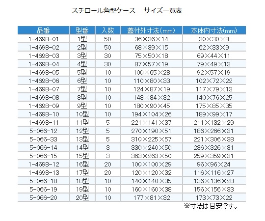 ●サンプル保管に便利な角型ケースです。●型番:16型●外寸法(mm):100×100×29●入数:1ケース(20個入)●材質:本体・フタ/PS(ポリスチレン)●色:透明