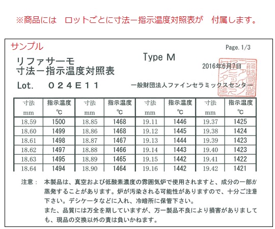 ●焼成工程の管理時に、熱履歴を容易に精度良く把握するための共通熱履歴センサーです。●焼成条件の共通化が可能となりますので、技術データの共有や比較評価が可能です。●定期的に連続して使用する事により、焼成炉の異常管理・統計的品質管理等に応用できます。●焼成条件、熱履歴により、再現性良く収縮緻密化する現象を利用した熱履歴センサーです。●炉内にセットした場合、雰囲気ガスの対流・発熱体や炉心管からの放射または輻射・熱伝導の3つが主な伝熱モードとなります。●類似センサーとして「ゼーゲルコーン」や「オートンコーン」、「メジャーリング」があります。●電気炉、連続炉、トンネル炉等の日常的な焼成条件の把握、焼成工程の標準化に利用されています。●通常の熱電対、電気計器などで管理できない温度の測定に使用されています。●適用温度範囲(℃):1400~1700●入数:1ケース(200個入)●リファサーモ●重量(kg):約0.78(参考値)