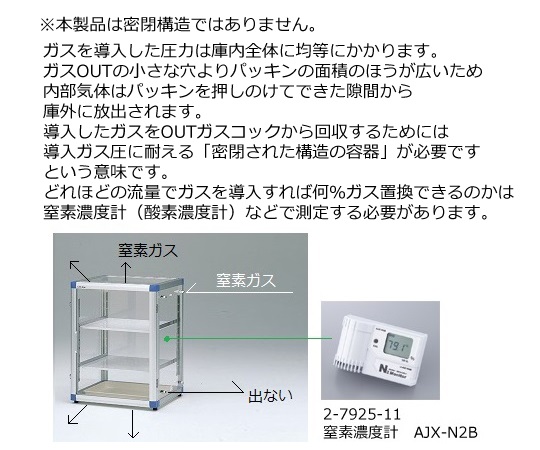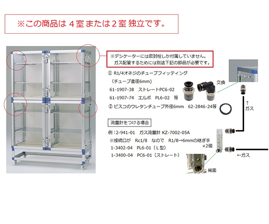 ●扉部は気密性に優れています。●ガス置換対応・各室独立タイプ(2室)で、1つの扉を開けても他室の環境を損ねることはありません。●各種アクセサリー(別売 1-5216-)のため、標準で各室4ヶ所のバルブ取り付けネジ(ガス置換孔)が付いています。●各室独立密閉型の超大型ガス置換デシケーター!●外寸法(mm)※1:574×520×1765●内寸法(mm)※1:494×460×720×2室●ステンレス棚・独立2室●材質:本体/PMMA(アクリル)、枠/アルミサッシ、棚板/ステンレス●棚板寸法:490×460mm●棚板取り付けピッチ:50mm(棚板間隔 40mm)●棚板耐荷重:約20kg/枚●バルブ取り付けネジ:Rc1/4×各室4個●重量:約41kg●キャスター:φ65mmナイロン製(ストッパー×2個付き)●※各室は独立しています。●付属品:棚板×4枚・シリカゲル皿×2枚●※1 突起部を除く●★※本製品は密閉構造ではありません。