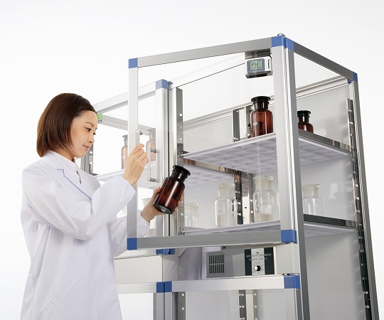 ●デシケーター内のデッドスペースを無くし、庫内を広く有効利用できます。●新型扉開閉機構を採用し、扉開閉時のデッドスペースを無くす事により、壁面に隙間なく設置できます。●新型除湿ユニットには駆動部が無く音や振動の発生源もありませんので、耐久性に優れています。●デシケーター内部の水分は直接気体状態で外部へ放出しますので、水滴(ドレン)が出ません。●キャスター付きで移動も容易です。●湿度調節は前面パネルでコントロール(アナログ設定)します。●軽量アルミフレームと樹脂製クリアパネルのスタンダードシリーズ。●新型固体高分子電解質膜(ロサール)を前面パネルに装備し庫内空気中の水分を直接電気分解し連続的に除去しますので、安定した除湿を行う事ができます。●オートドライタイプ●除湿方式:固体高分子電解質膜によるH2O電気分解排出●湿度設定範囲:20~50%RH●湿度制御範囲:20%RH~室内湿度(庫内無負荷時・使用環境による)●湿度制御方式:ダイヤル自動調節式(相対湿度)●除湿素子有効膜面積:約49cm2●材質(本体/枠):PMMA(アクリル)/アルミ●キャスター仕様(前輪2ヶ所ストッパー):φ65mmPAナイロン製●棚板仕様:ステンレス製●棚板寸法/取付けピッチ:490×460mm/50mm●棚板間隔:40mm●棚板耐荷重:約20kg/枚●扉パッキン:マグネット式●電源:AC100V 50/60Hz●平均消費電力:5W●最大消費電力:30W●電源コード長:約2m(3Pプラグ)●本体重量:29kg●付属品:棚板×4枚、デジタル温湿度モニター(THA-01M)●外寸法(mm):574×522×1774●内寸法(mm):494×460×1470●庫内コンセント:無し●※レンタル機をご用意しております。●※特注及び追加工可能です。●※運送費・搬入費・据付費・組立費等が別途必要です。お問い合わせください。
