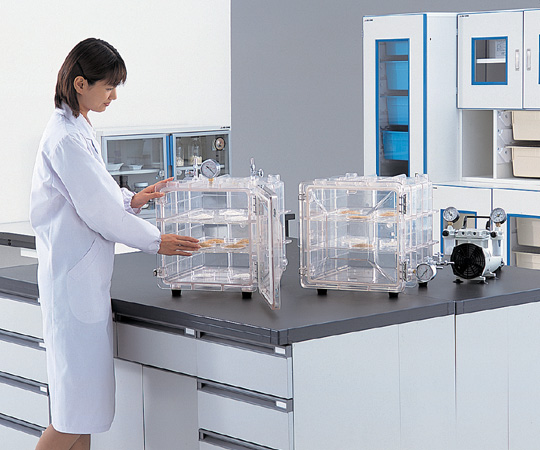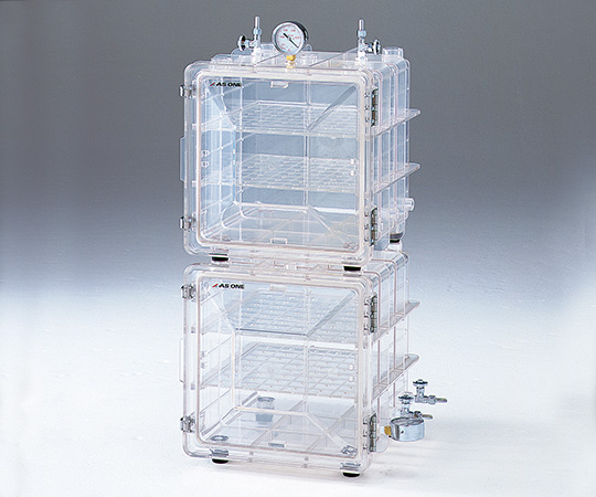 ●ポリカーボネート一体成型の強靭な真空デシケーターです。●扉と本体のシール部には密閉性の高いシリコンパッキンを使用しており、グリース等の必要がありません。●真空ゲージ及びバルブは本体上面及び右側面のどちらにでも取り付けることができます。●本体を2段に重ねての使用も可能です。●外寸法(mm):360×390×385●内寸法(mm):308×310×308●★入数:1個●材質:ポリカーボネート●許容真空度:約133Pa(1Torr)●棚段数:5段●容量:最大32L●耐荷重:本体/約50kg、棚板部/約5kg●重量:約13kg●付属品:真空バルブ(Φ8mmニップル・土台部R1/4)×2個、真空ゲージ×1個、棚板×2枚●推奨真空ポンプ:1-4148-03/DTC-41、1-4148-11/DTC-22