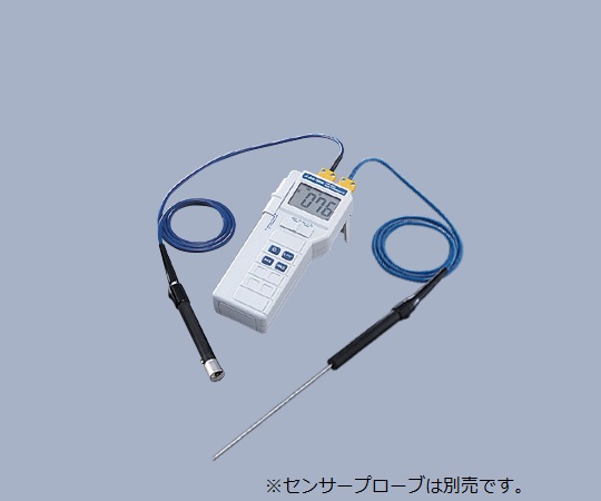 ●測定データを固定するデータホールド機能付きです。●測定時の最高温度を自動的にメモリし、測定後に呼び出す事ができる最大値メモリ表示機能付きです。●表示部にはバックライト機能付きで、暗い場所での計測にも安心です。●2点(T1-T2)の温度測定が可能で、測定値の差を表示する事ができます。●入力数:2●測定範囲:-50~1300℃●分解能※1:-50.0~199.9℃は0.1℃、200~1300℃は1℃(切り替え式)●センサータイプ:K熱電対●測定範囲:-50~1300℃●操作機能:2点切り替え表示・2点間温度差表示●本体精度:-50~1000℃/±(0.3%rdg+1℃)、その他/±(0.5%rdg+1℃)●サンプリングレート:2.5回/秒●表示:3.5桁LCD表示●使用温湿度:0~50℃・0~80%RH(0~35℃)●保存温度:-20~60℃●電源:006P(9V)乾電池×1本(テスト用付属)●サイズ:156×65.5×35mm●重量:約177g●※センサープローブは別売です。IKシリーズ(1-5522-01~17)、DSシリーズ(3-1564-01~06)からお選びください。●※1 分解能は-50.0から+199.9℃は0.1℃、+200~+1300℃は1℃