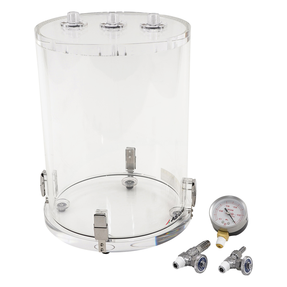 ●真空度が一目でわかる真空計付属●真空バルブは外径φ8mm・φ14mmの2ポートを準備●本体材質:胴部/透明強化PMMA(アクリル)板厚8mm、天板・底板/強化PMMA(アクリル)板厚20mm、バルブ・真空計取り付け部/PC(ポリカーボネート)●重量:5.8kg●許容真空度:約133Pa●型番:VZ型●外寸法(mm):φ268×450※真空メーター含む●内寸法(mm):φ234×298●付属品:真空バルブ:(小)外径φ8mm×1個・(大)外径φ14mm×1個 、真空計×1個●推奨真空ポンプ:(1-4148-11)ドライ真空ポンプDTC-22、(1-671-06)ドライ真空ポンプDA-20D