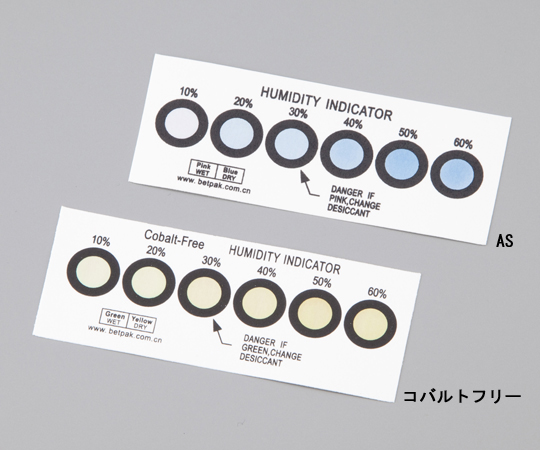 ●密閉容器やパック内の湿度が外から確認できます。●耐衝撃性に優れています。●型番:コバルトフリー●反応湿度:10-20-30-40-50-60%RH(6点)●精度:±5%(25℃)●変色色調:黄→緑●サイズ:約39×100mm●入数:1缶(150枚入)●可逆性