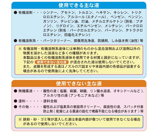 ●有機溶剤・防錆剤(エアゾールタイプ)・有機溶剤系クリーナー(ガスの入っていないもの)に使用できます。●材質:本体/特殊ガラス繊維強化ポリプロピレン、容器/PE(ポリエチレン)、ノズル/PP(ポリプロピレン)、ノズルパッキン/NBR(ニトリルゴム)●容量(mL):500●サイズ(mm):φ102×216●エクセレント