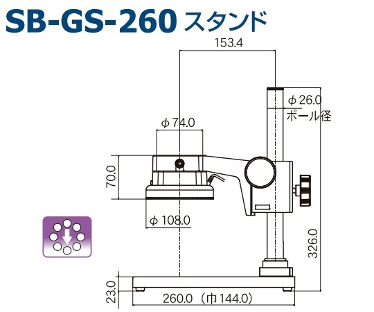●照明:LED(球数60個)●総合倍率(実視野):10(φ23mm)~44×(φ5.2mm)●対物レンズ:1×~4.4×(ズーム比4.4)●接眼レンズ(実視野):DSW10×(23)●鏡体機能:傾斜角45°・360°回転式、両眼視度調節可能(+5.6D±7.2D)●作動距離:90mm ●材質:ステージプレート/PMMA(アクリル)製(白・黒×各1枚)●電源:AC100-240V 50/60Hz●電源コード長:2m(2Pプラグ) ●ステージプレート:135×195mm●高さ:326mm ●重量:4.3kg