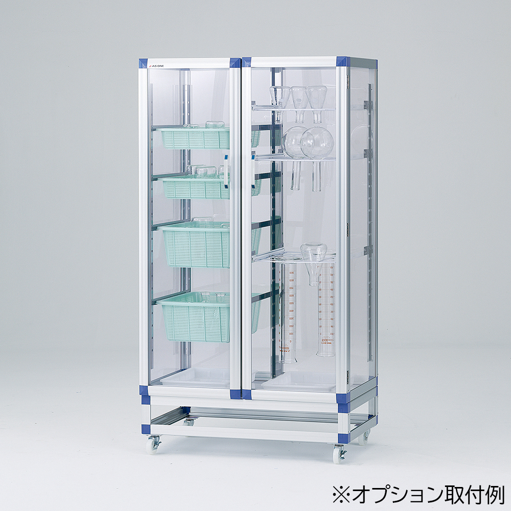 ●本体パネルに再生PET使用した乾燥保管庫です。●マグネットパッキンの採用により、常に清潔に器具を保管することができます。●棚間隔は、50mmピッチで任意の位置に取り付けることができます。●メッシュ棚(別売)はスライドレール式で、スムーズに引き出すことができシリンダーやフラスコの出し入れに便利です。●材質:本体パネル/再生PET(ポリエチレンテレフタレート)、枠/アルミニウム(アルマイト処理)●扉:マグネットパッキン式●キャスター:φ65mmPA(ナイロン)製●重量:38.4kg●メッシュ棚取り付け可能数:21段×2列●浅型バスケット取り付け可能数:11段×2列●深型バスケット取り付け可能数:5段×2列●付属品:水受バット:2枚●型番:AGWPT●外寸法(mm):858×543×1595●内寸法(mm):778×480×1320●※網棚・バスケットは付属していません。用途に合わせてアクセサリー(3-5034-01~07)よりお選びください。