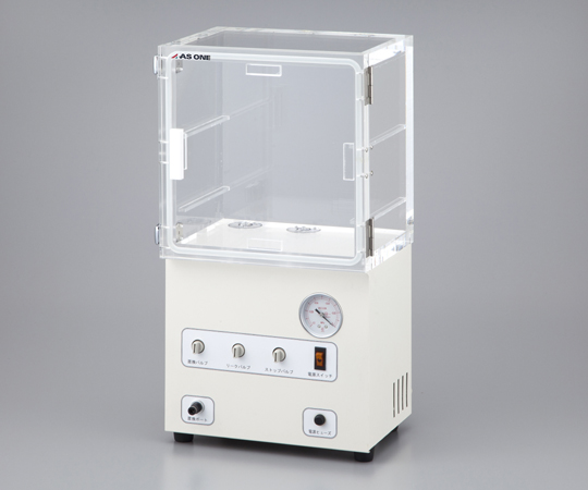 ●ダイアフラム型ドライ真空ポンプ・ガス置換用バルブを内蔵していますので、配管等の手間が不要です。●省スペースでオールインワンタイプ。●材質:デシケーター部/透明強化PMMA(アクリル)・板厚20mm、下部ポンプ室/スチール焼付塗装●ガス置換用接続口:φ6mmナイロンフィッティング●真空ゲージ装備●重量:21kg●外寸法(mm):300×222×570●内寸法(mm):260×180×260●PMMA(アクリル)製棚板×2枚付き●<内蔵真空ポンプ>●真空到達圧力:5.3kPa(40Torr)●排気速度(50/60Hz):20/24L/min●電源:AC100V 50/60Hz●電源コード長:3m(3Pプラグ)●※バルブ取付、ネジ加工等の追加工が可能です。お問い合わせください。