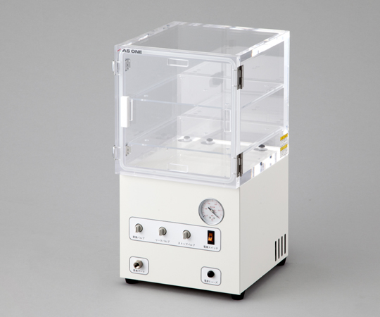 ●ダイアフラム型ドライ真空ポンプ・ガス置換用バルブを内蔵していますので、配管等の手間が不要です。●省スペースでオールインワンタイプ。●材質:デシケーター部/透明強化PMMA(アクリル)・板厚20mm、下部ポンプ室/スチール焼付塗装●ガス置換用接続口:φ6mmナイロンフィッティング●真空ゲージ装備●重量:23kg●外寸法(mm):300×322×570●内寸法(mm):260×280×260●PMMA(アクリル)製棚板×2枚付き●<内蔵真空ポンプ>●真空到達圧力:5.3kPa(40Torr)●排気速度(50/60Hz):20/24L/min●電源:AC100V 50/60Hz●電源コード長:3m(3Pプラグ)●※バルブ取付、ネジ加工等の追加工が可能です。お問い合わせください。