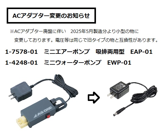●実験室でもフィールドでも使用できるミニエアーポンプです。●別売のバッテリーパックを使えば屋外でも使用可能です。●小型のコンプレッサーとしても使用可能です。●ボリュームで吸気量を変更することが可能です。●型番:EAP-01●本体(ACアダプター付)●最大吐出流量:1.5L/min●最大圧力:26.6kPa(200mmHg)●最大真空到達度:-26.6kPa●接続口径:φ5.5mmニップル●接ガス部材質:クロロプレン・PB樹脂●電源:DC12V AC100V 53W(ACアダプター付属)●電源コード長:約1.5m●重量:235g●吐出・吸引兼用●サイズ:57×166×36mm