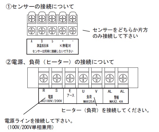 ●最大25Aの大容量温度調節器ですので、大型ヒーター等の制御が可能です。●100V・200V兼用ですので、1台で幅広く使用できます。●3パターンのタイマー設定が可能です。●K熱電対・Pt100Ωの両方を選択使用可能です(出荷時設定はK熱電対)。●温度設定範囲(Ptセンサー/K熱電対):0.0~200.0℃/0~500℃●温度制御方式:PID制御・SSR出力●接続容量:AC100/200V 25A●タイマー種類:オートスタート・オートストップ・SVスタート●タイマー設定可能時間:1分~99時間59分●温度表示精度(K熱電対使用時):±2℃または指示値±0.3%+1digitのどちらか大きい方●出力:制御電圧出力/AC100/200V 25A、警報接点出力/AC100/200V 2.4A MAX(抵抗負荷)●電源コード:無し(背面端子台の電源端子に接続)●安全装置:過電流ブレーカー●サイズ:190×239×220mm●※センサーは付属していません。用途に応じた形状・種類のものをお選びください(コネクタータイプは不可)。●※電源コードは付属していません。ご使用の電源電圧に合わせてご用意ください。