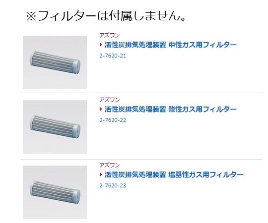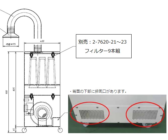 ●排気ダクト不要で強力吸引。●室内排気式の活性炭入り乾式スクラバーですので、面倒な外気ダクトが不要です。●ドラフト内では対応できない大型実験でのスポット排気にご利用いただけます。●最大静圧(ファン単体):0.6kPa(50Hz)、0.85kPa(60Hz)●最大風量(ファン単体):4.5m3/min(50Hz)、5.5m3/min(60Hz)●材質:外装/鋼板焼付塗装●電源:AC100V 50/60Hz(3Pプラグ)●キャスター:φ50mmナイロン製(正面側ストッパー付き)●フィルター:1セット(9本入)使用(別売)●使用時間積算計機能付き●付属品:ダクト(φ75×800mm、PP)・丸型フード(φ75mm、PET)●外寸法(mm):400×400×900(突起部除く)●※局所排気装置の申請が必要な場合のご使用には適しません。●※本商品は少量ガスが対象です。●※本体にフィルターは付属していません。