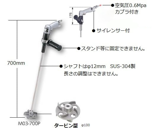 ●回転数:350・700rpm(2段階)●全長:700mm●最大トルク:15.7N・m●シャフト:φ12×470mm●プロペラ径:φ100mm●材質:シャフト/ステンレス(SUS304)、プロペラ/アルミニウム●サイレンサー付き●付属プロペラ数:1枚●空気圧:約0.59MPa●出力:0.28kW●最大空費:0.35m3/min●重量:1.9kg●推奨ホース径:φ6.5mm●ホース接手:PT1/4