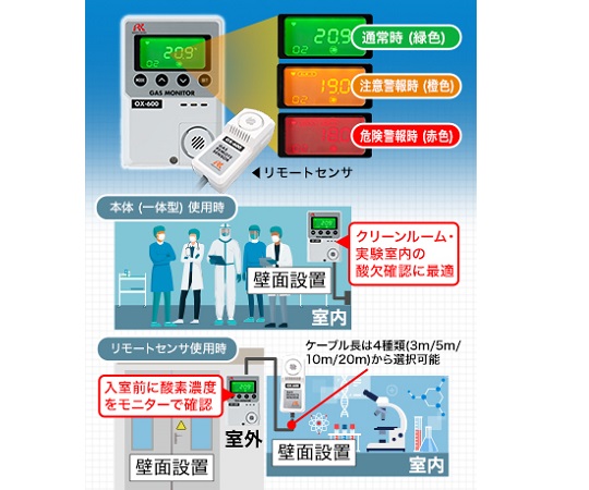 ●クリーンルームや研究室内などの酸欠事故防止に!!●大きくて見やすい!3色に光るLCD画面表示●圧力補正機能付きによる気圧の影響による指示値の変動がありません●従来機種からの小型・軽量化・表示画面サイズ拡大、上下ボタンの追加により操作向上●JIST82012010(酸素欠乏測定用酸素計)に準拠●AC電源ケーブル3.2mが標準付属●検知対象ガス:酸素●検知原理:隔膜ガルバニ電池式●濃度表示:LCD デジタル表示(3 桁・7 セグメント/緑・橙・赤3 色バックライト)●検知範囲(vol%):0-25●表示分解能(vol%):0.1●検知方式:拡散式●警報設定値:1st 19vol%(L)/2nd 18vol%(LL)【標準設定値】●指示精度(同一条件下):±0.7vol%以内●応答時間(同一条件下):90%応答30 秒以内●警報遅れ時間(同一条件下):酸欠警報(18vol%L 警報)において10~11vol%のガスを検知させて5 秒以内●警報設定値の精度:警報設定値と警報を発したときの濃度指示値との差は0●ガス警報タイプ:2 段警報(L-LL)●ガス警報表示:1st:濃度表示及びバックライト点灯(橙)・ブザー/2nd:濃度表示及びバックライト点灯(赤)・ブザー●ガス警報動作:自己保持●ガス警報接点:無電圧接点各1a・常時非励磁(警報時励磁)●故障警報・自己診断:システム異常/センサ接続異常●故障警報表示:内容表示及びバックライト点滅(赤)・ブザー●故障警報動作:自動復帰●接点容量:AC125V・1A●伝送仕様:DC4~20mA(非絶縁・負荷抵抗300Ω以下)●検知部間ケーブル:リモート専用ケーブル(10m)●電源:AC100V±10%・50/60Hz●消費電力:AC 仕様:最大5VA●使用温度範囲:-10~40℃(急変なきこと)●使用湿度範囲:90%RH 以下(結露なきこと)●使用圧力範囲:大気圧(80kPa~105kPa)●構造:壁掛型・リモート型●外形寸法(mm):【本体】約80(W)×120(H)×35.5(D)【リモートセンサ】約40(W)×96(H)×35.5(D)(突起部は除く)●質量(g):【本体】約200【リモートセンサ部】約55(ケーブルを除く)