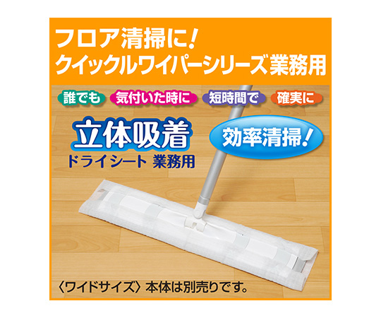 ●約96万本のミクロの繊維が細かなホコリ・髪の毛まで、しっかりからめとって離しません。●ホコリがたたず衛生的です。●シートは両面使え、ベタつかないドライタイプです。●幅広タイプです。●業務用ワイドサイズ(540mm×205mm)●使用後はシートを取り外すだけなので、後片付けの手間も省けます。●※別売りの「クイックルワイパー業務用本体」(1-8111-22)に取りつけてご使用ください。●成分:流動パラフィン●用途:床(フローリング、ビニール)・畳・壁・天井・家具・戸棚・電気製品・電話等●シートサイズ:540×205mm●シート材質:PE(ポリエステル)・PP(ポリプロピレン)●1箱(50枚/袋×12袋入)